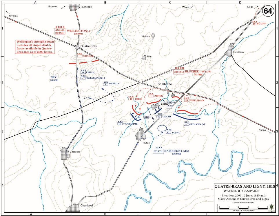 In the event, Napoleon’s plan to disrupt the coordination of two allies collapsed; on 16 June, Wellington and Blücher literally met in person! Instead of having to fight no battles, Napoleon would have to fight two.