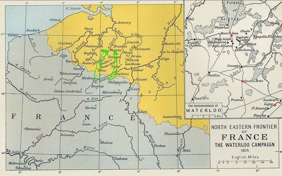 I at least have heard the following too many times to count: ‘Napoleon could not have won at Waterloo’, ‘Napoleon was out of his prime by 1815’, ‘the French army of 1815 was far from its heyday’. Maybe, but look at the days preceding the battle and one cannot help but be impressed by his persistent talent. What if I told you that Napoleon never wanted a battle at Waterloo in the first place? The fact that it happened already represented the downfall of his plan…