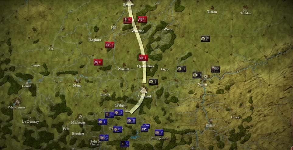 See above (in my crude green arrows) the respective trajectories of the Mons and Charleroi plans. Beckett speculates that the Mons Plan was a ruse; its orders were uncharacteristically imprecise for the meticulous Napoleon, while the Charleroi Plan was decked out with impressive detail — which was closer to the Emperor’s modus operandi. Either would probably have done what he was really trying to achieve: the execution of the signature position centrale (central position) strategy, whereby, in a form of defeat-in-detail, the French army would insert itself in-between two distinct enemy forces (when both forces combined would outnumber the French one). While a portion of the French would hold off one force, the majority would be defeating the other. Once achieved, the French army as a whole could recombine against the enemy remnants, winning two battles where one battle would have returned defeat.